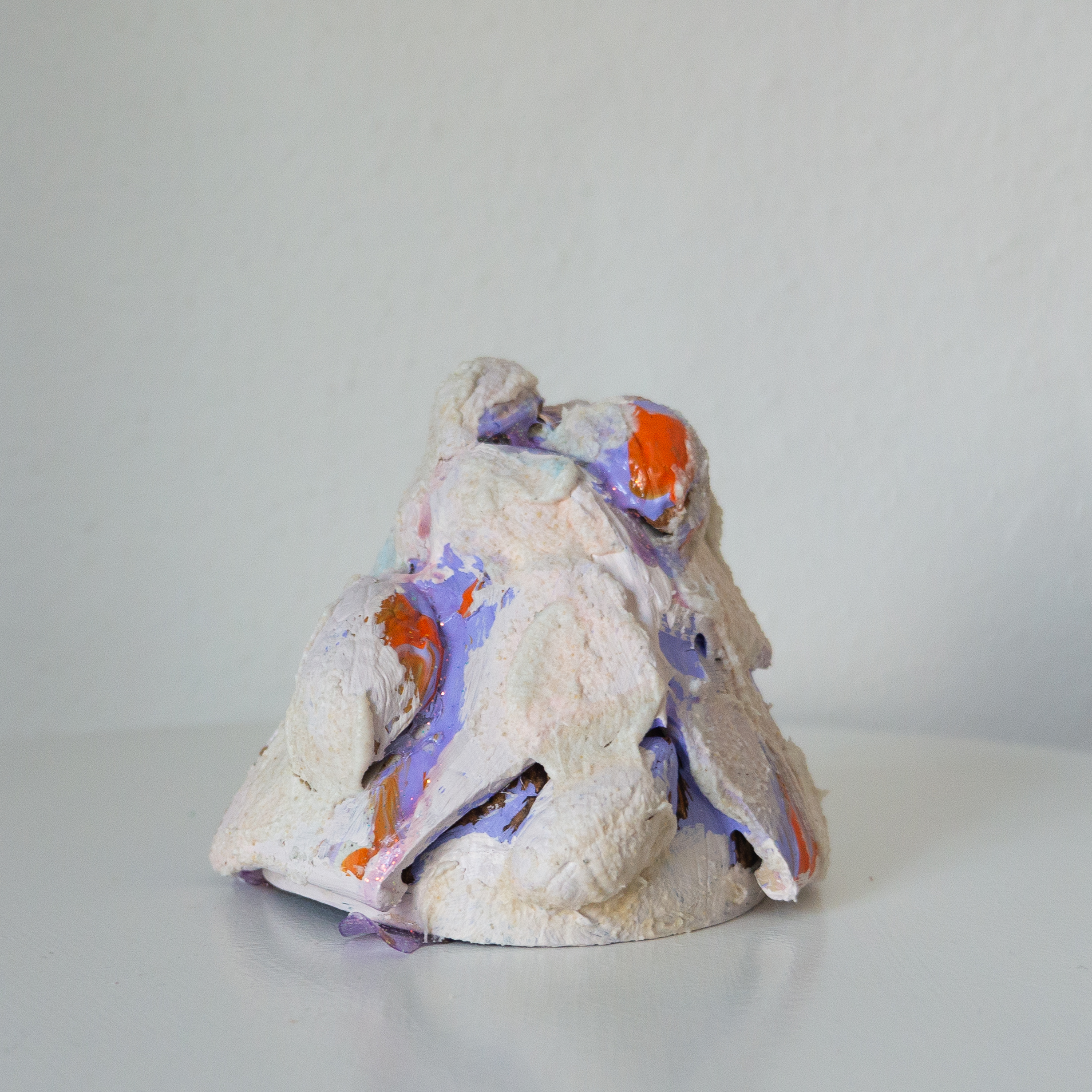 Sculpture of re-used materials: a coconut shell, wallnut shells, broken pot, cobber plates, paint and glitter.