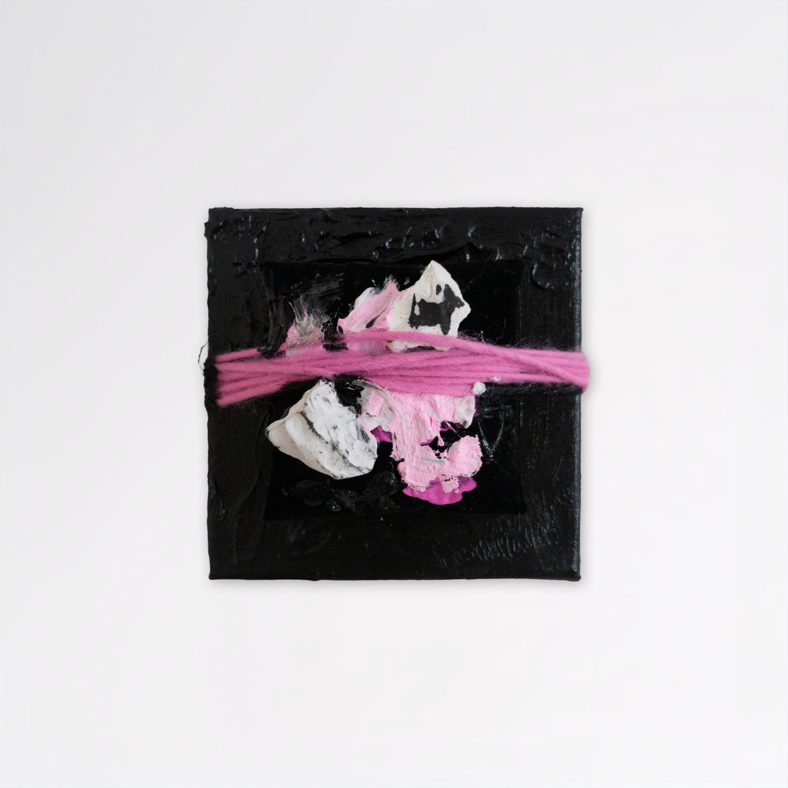 Mixed media assemblage with a canvas, a velvet pillow, two stones, wool yarn and paint.