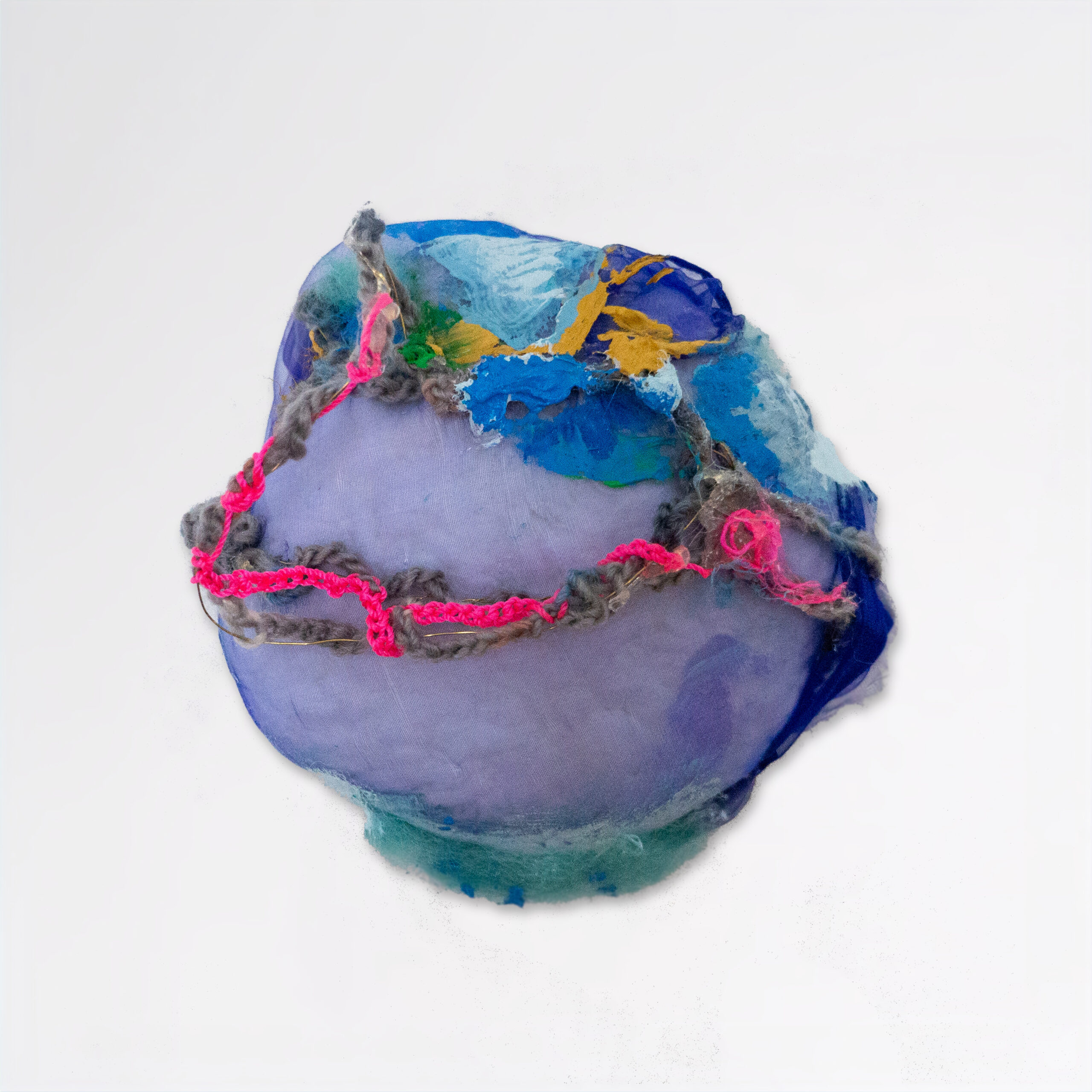 Wall hanged sculpture made with a wood place, felt, fabric, pillow filling, crocheted yarn, string, metal wire, glue and acrylic paint.