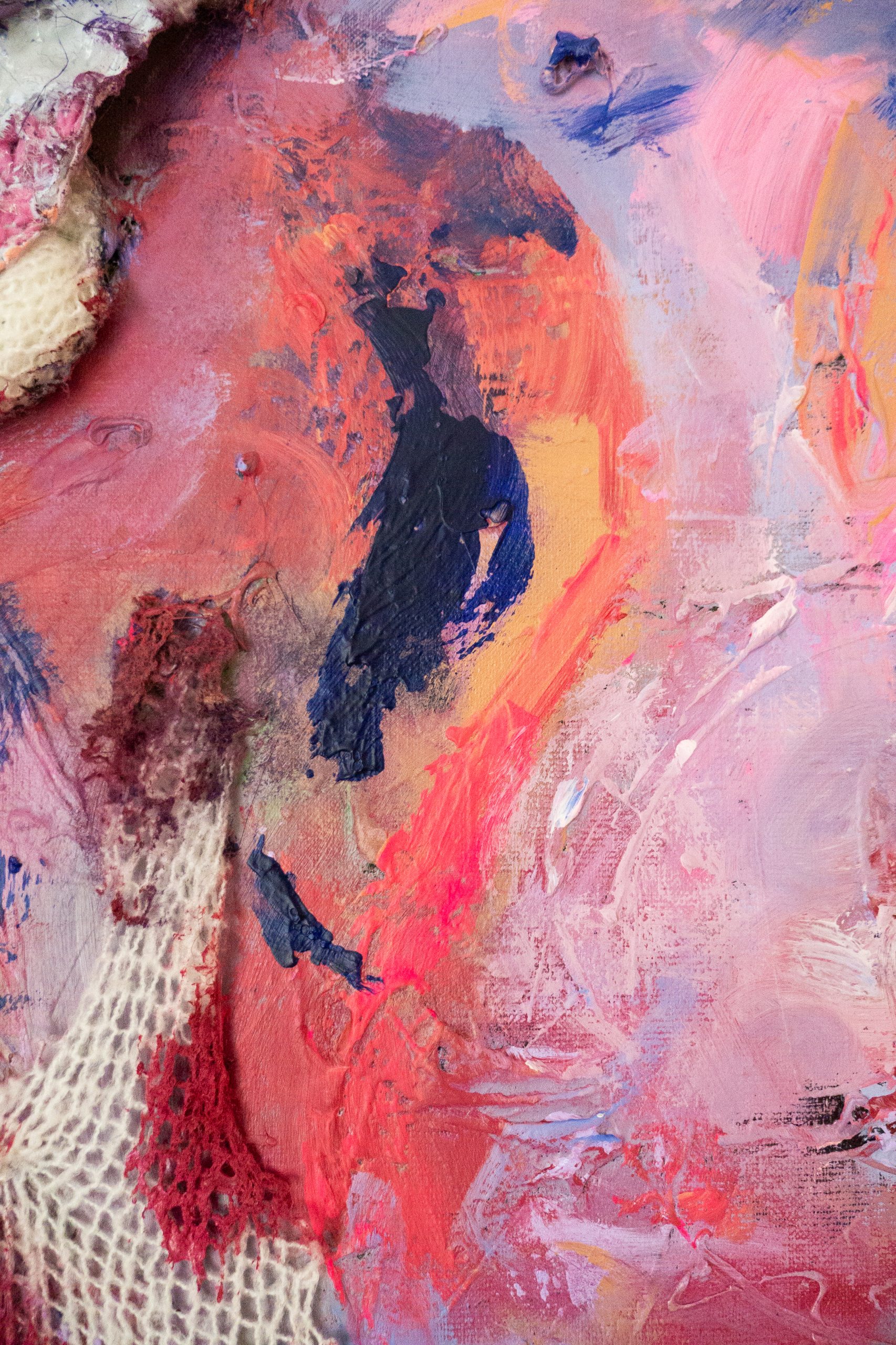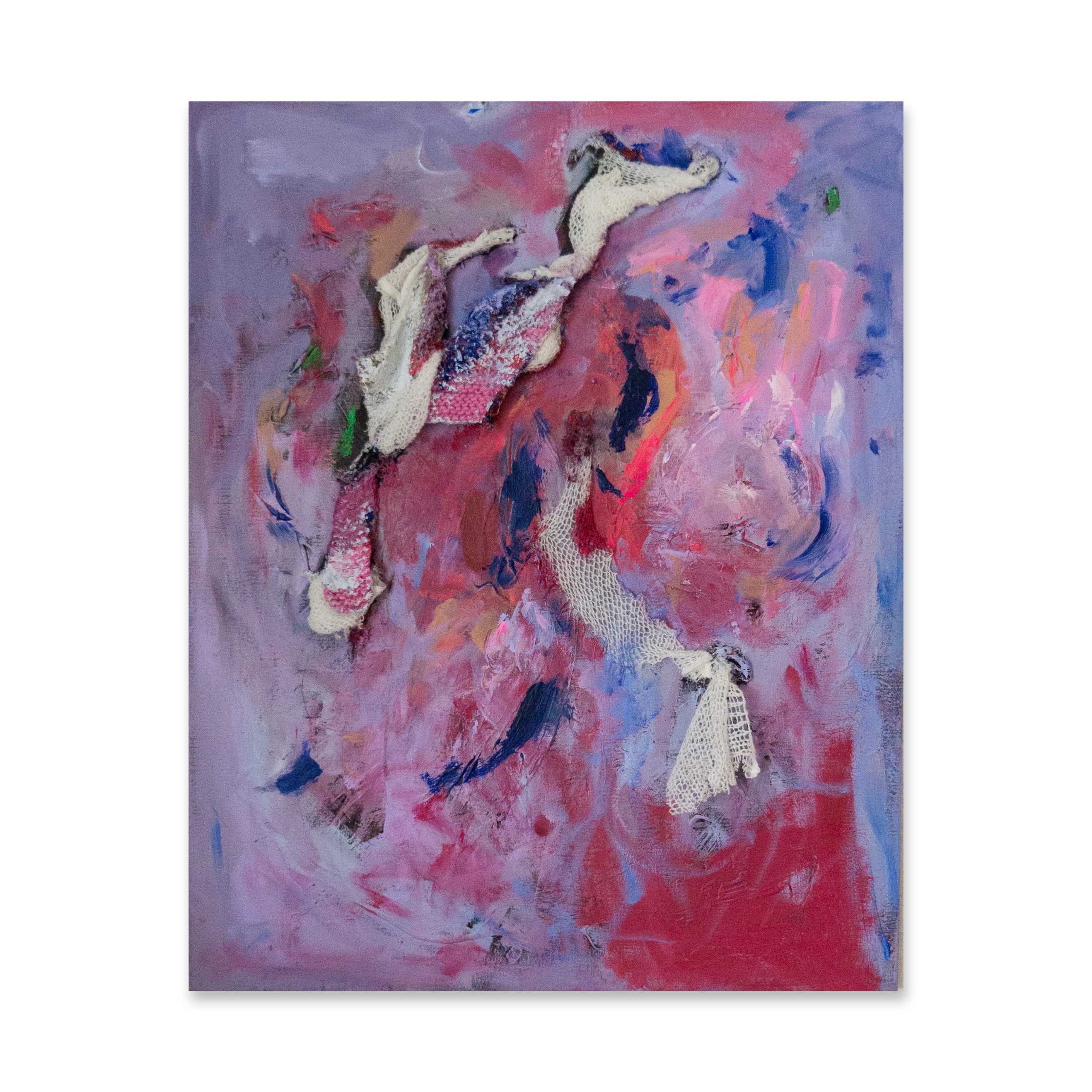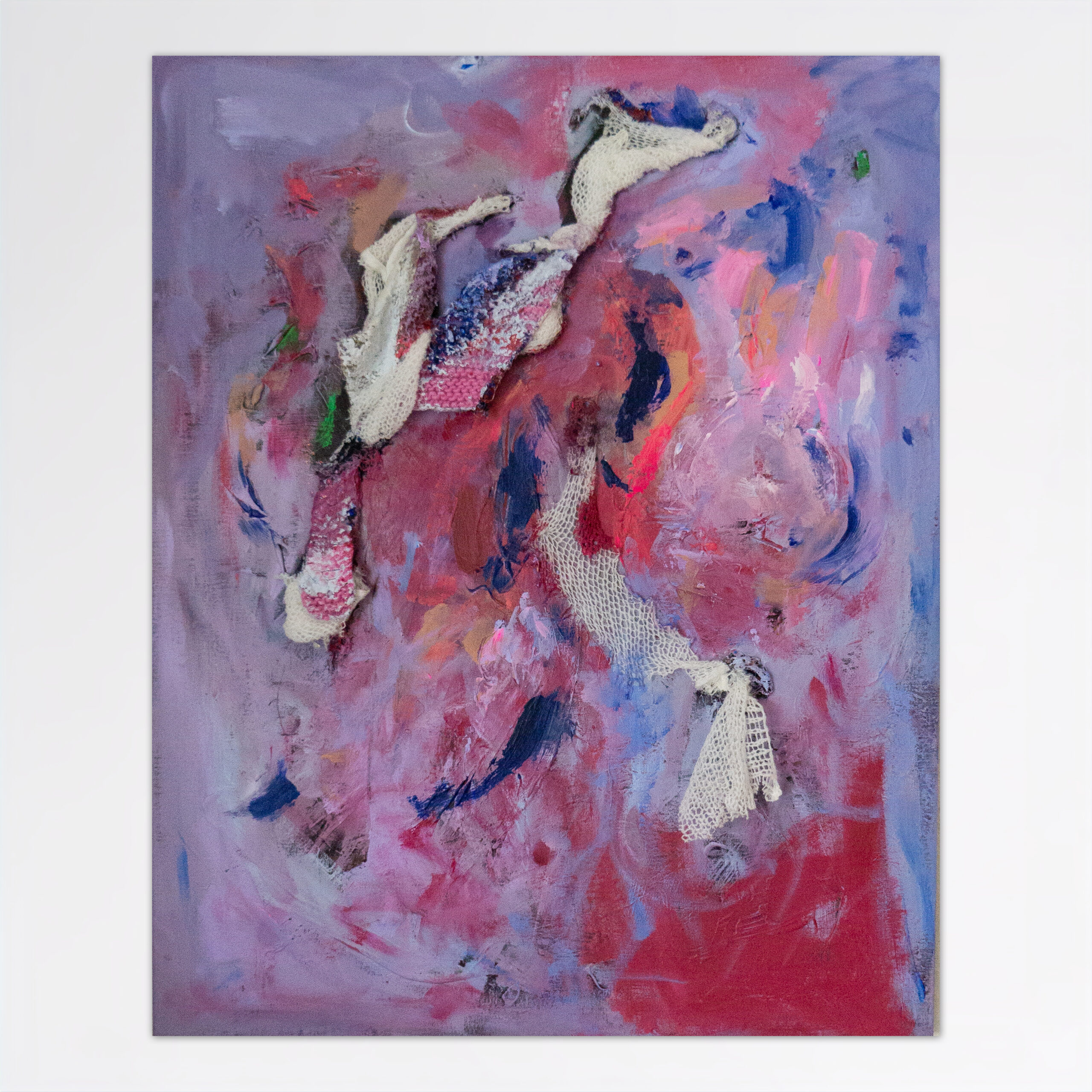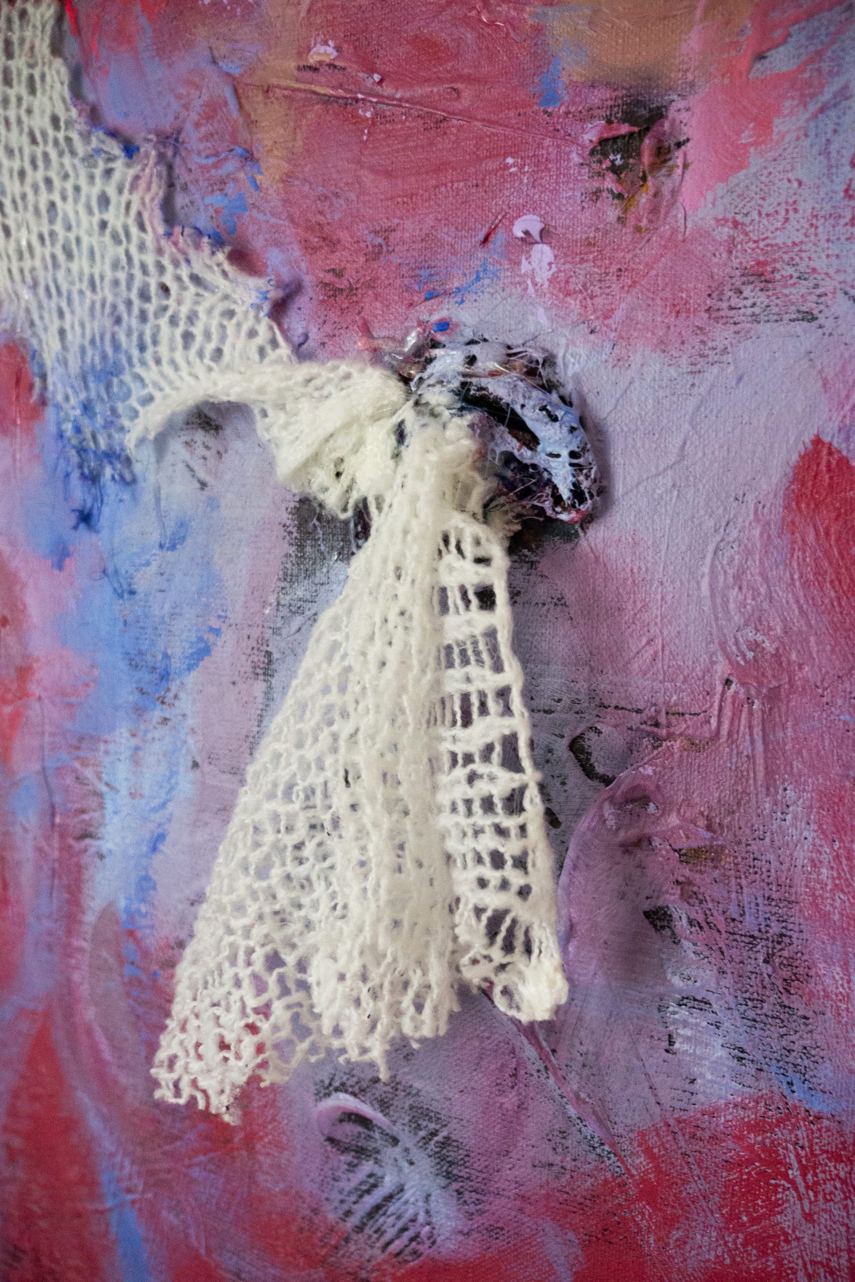 Linen canvas, hand knitted pieces, acrylic paint, cotton knit, glue, glitter.